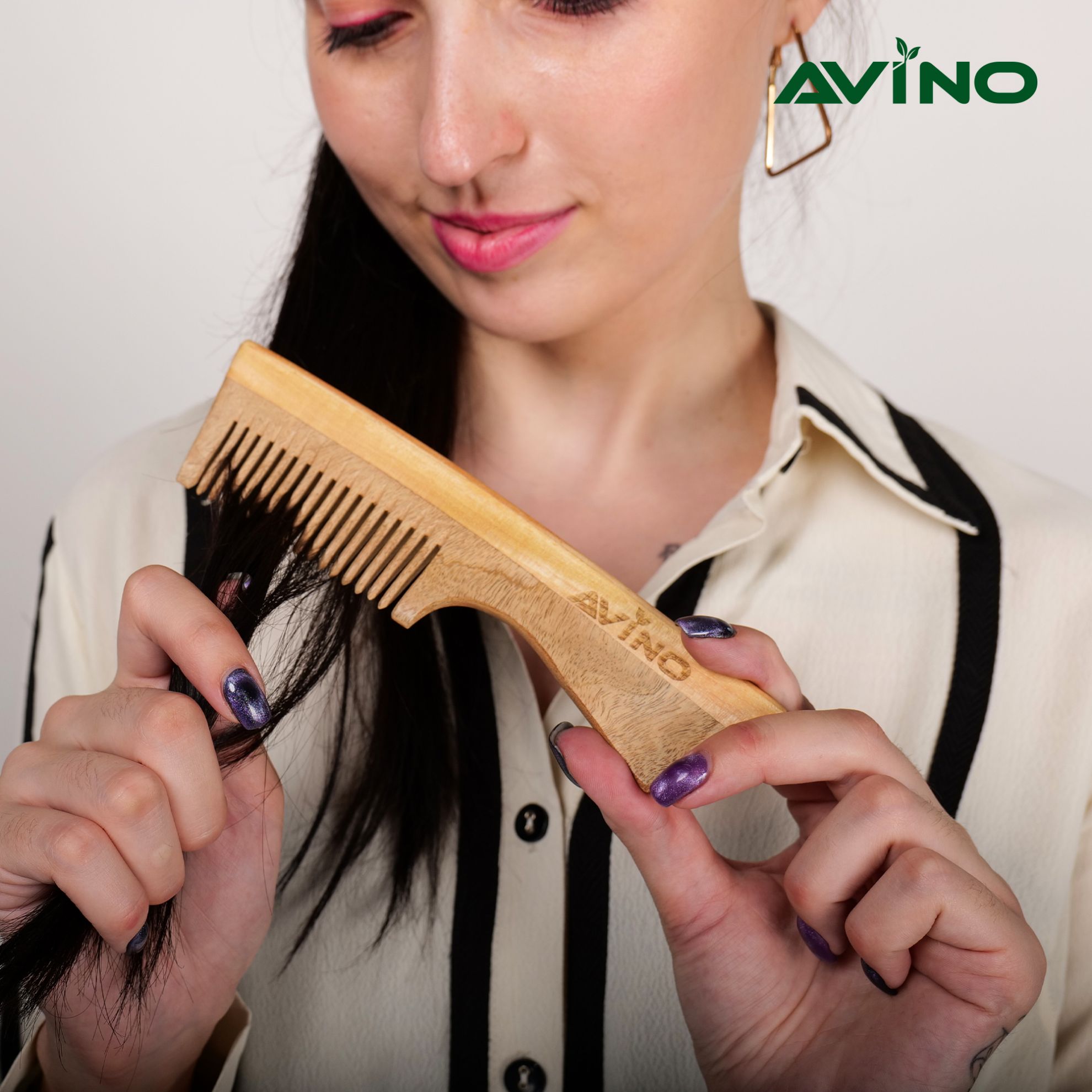 Avino neem wood comb ideal for all hair types for both men & women. Neem combs are believed to have a number of benefits for hair and scalp health, including anti-dandruff, moisturizing, strengthening, and rejuvenating properties.